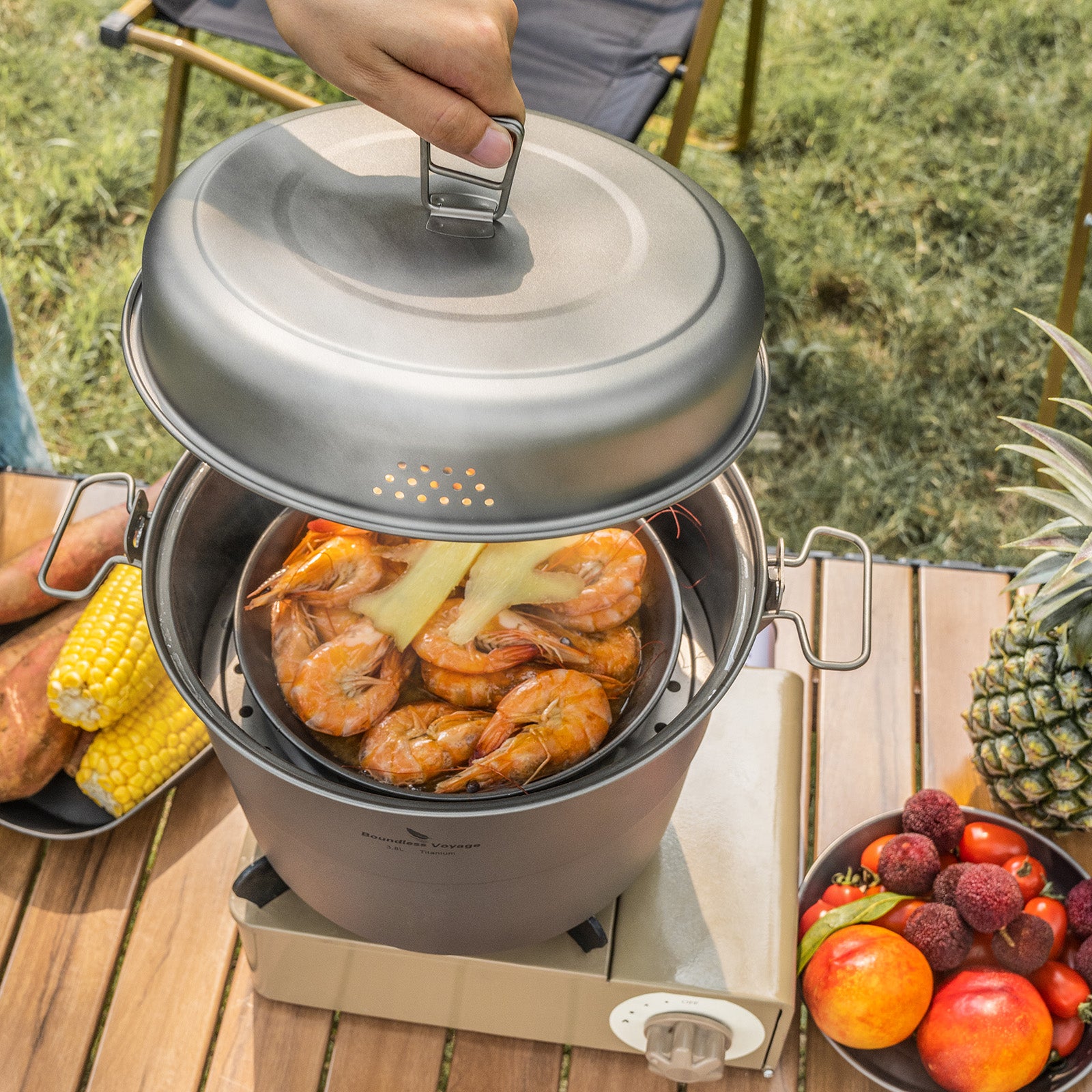 TA1 titanium pot + TA2 titanium steamer + stainless steel handles for durability and stability. -