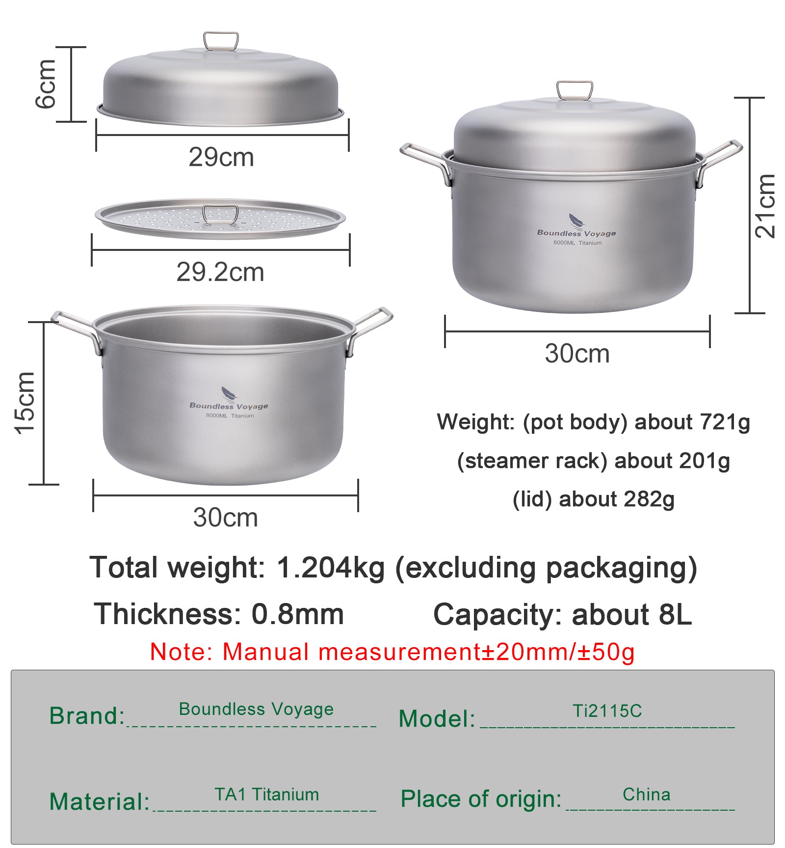 Weight: (steamer rack) about 201g; (lid) about 282g; (pot body) about 721g