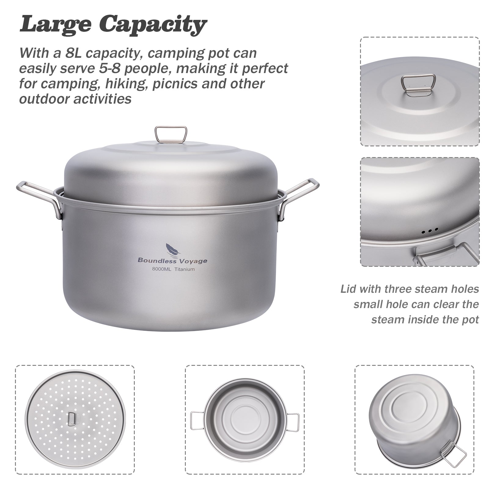 Boundless Voyage Titanium Steamer Soup Pot Outdoor Camping Cookware Lightweight Picnic Hiking Hanging Pot Portable Travel Household Kitchenware Cooking Kit