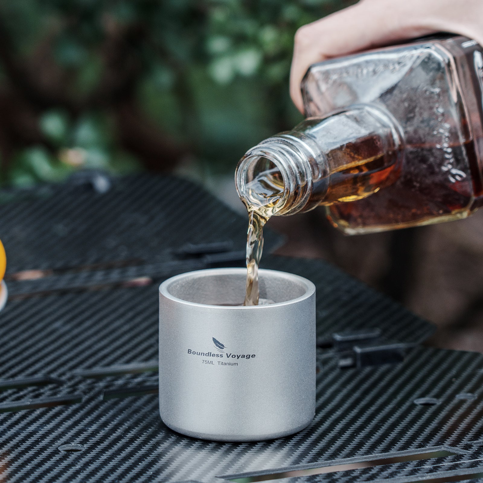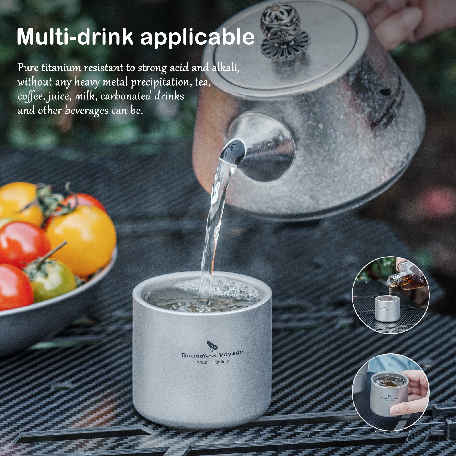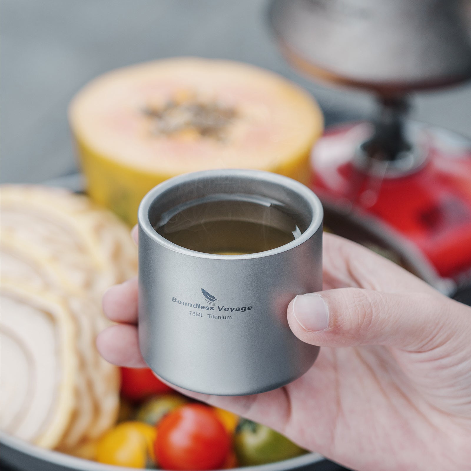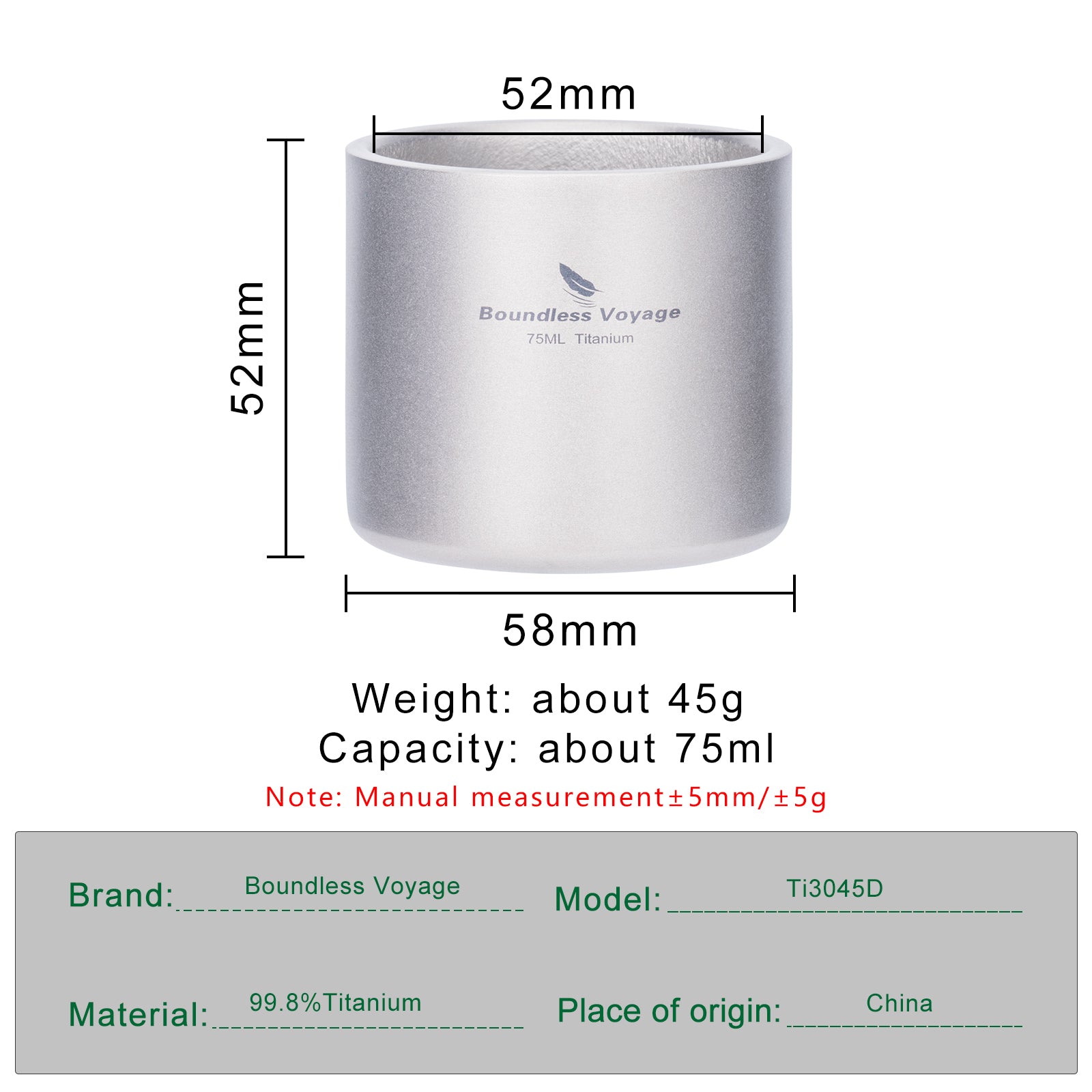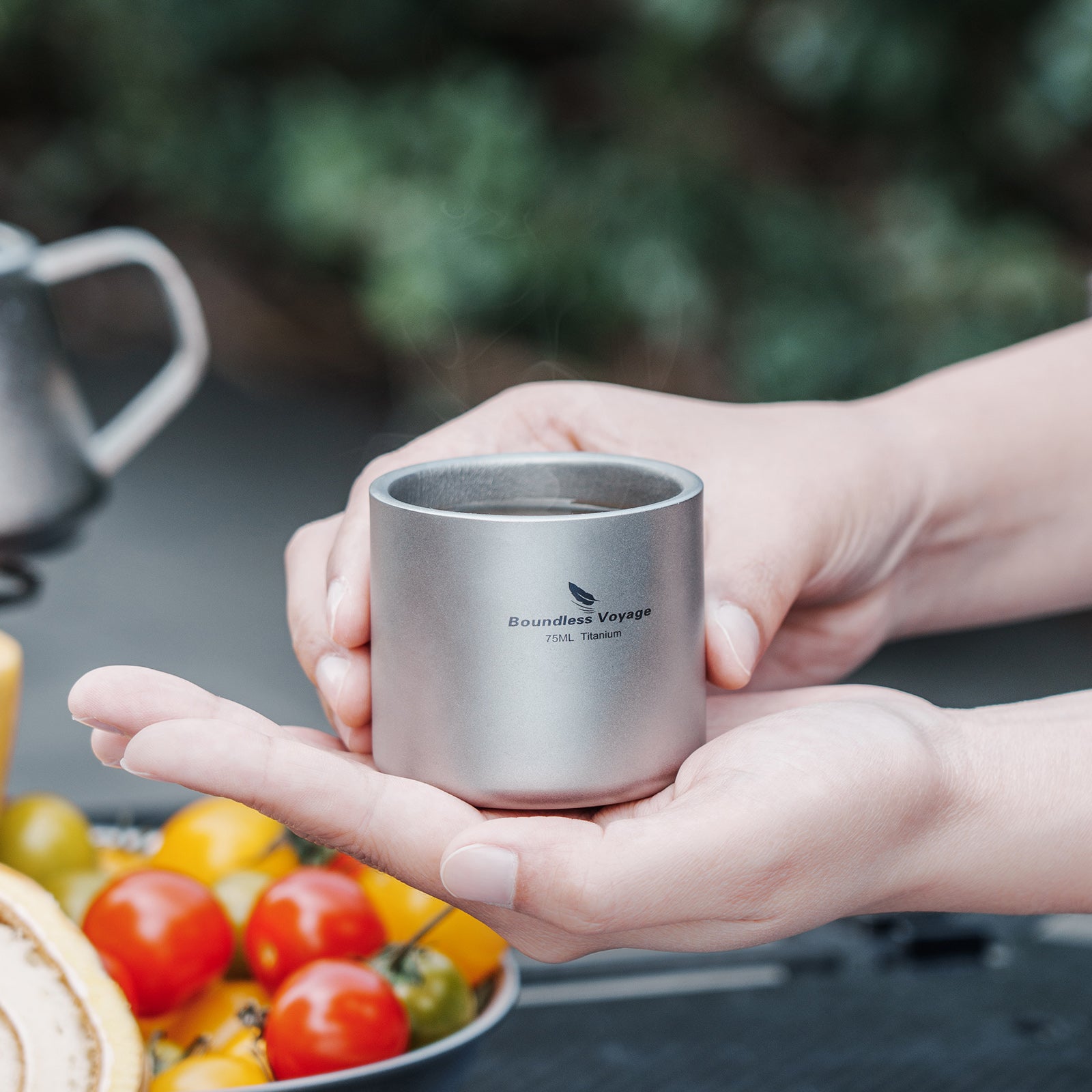 Boundless Voyage Titanium Double-wall Mug Cup Backpacking Portable Camping Cup 75ml Lightweight Heat Resistant Coffee Mug Tea Cup with Storage Bag for Hiking Picnic Travel or Daily Use