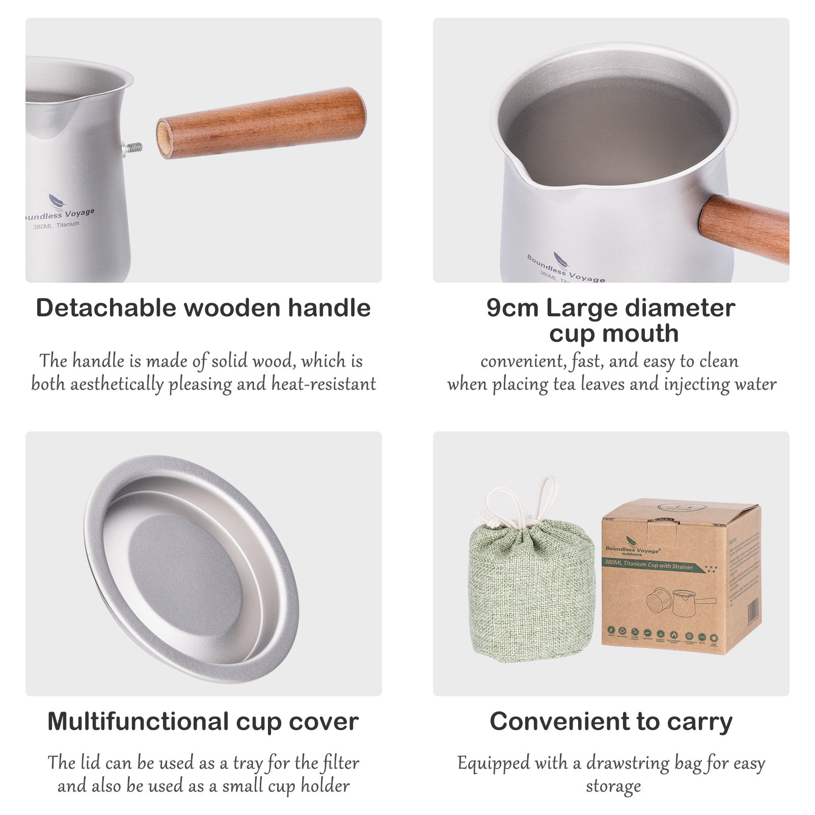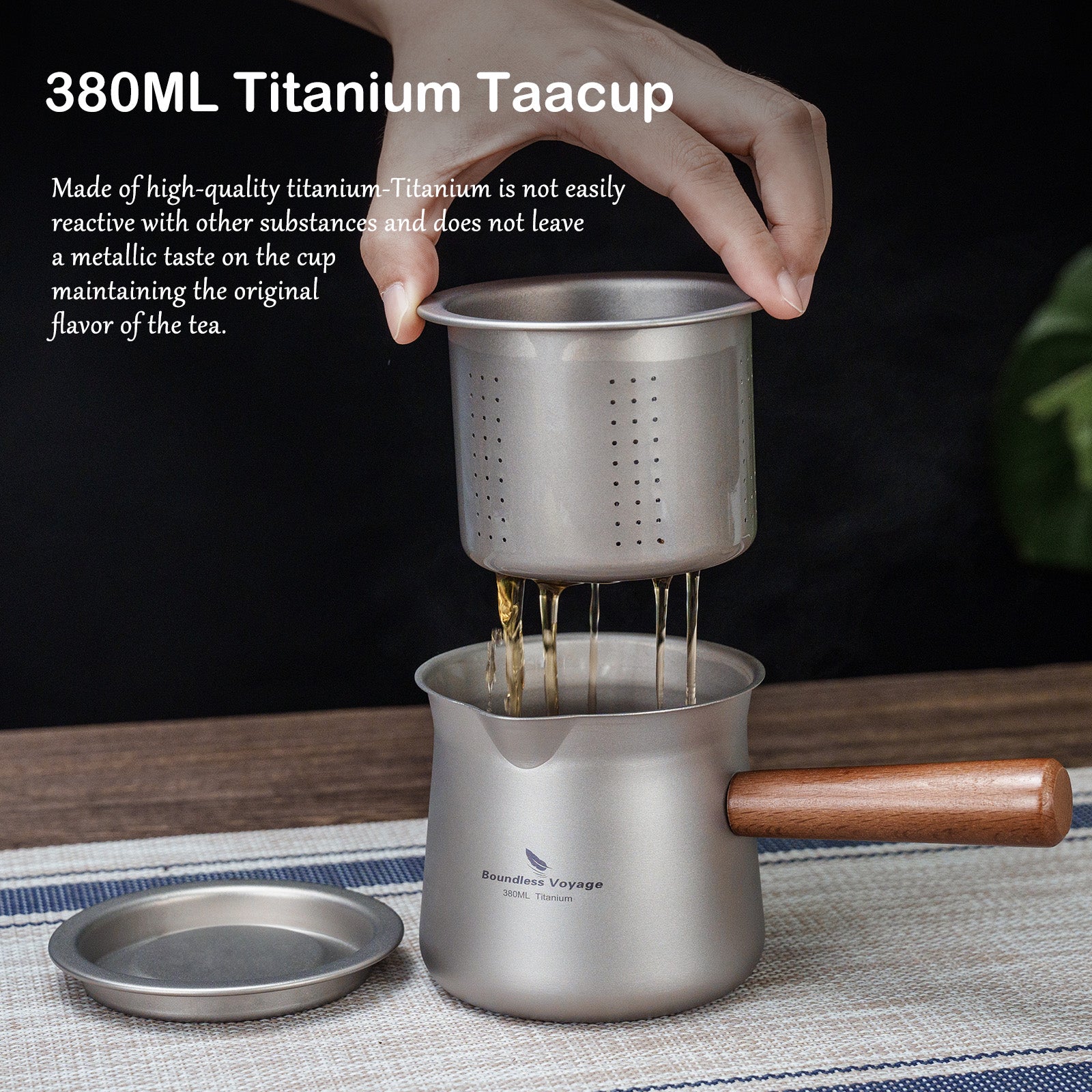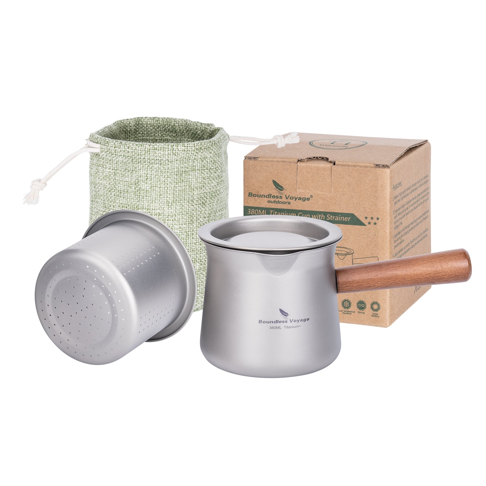 Boundless Voyage 380ML Titanium Cup with Strainer Mini Teacup Single Layer with Wooden Handle Ultralight Outdoors for Camping Hiking Water Cup