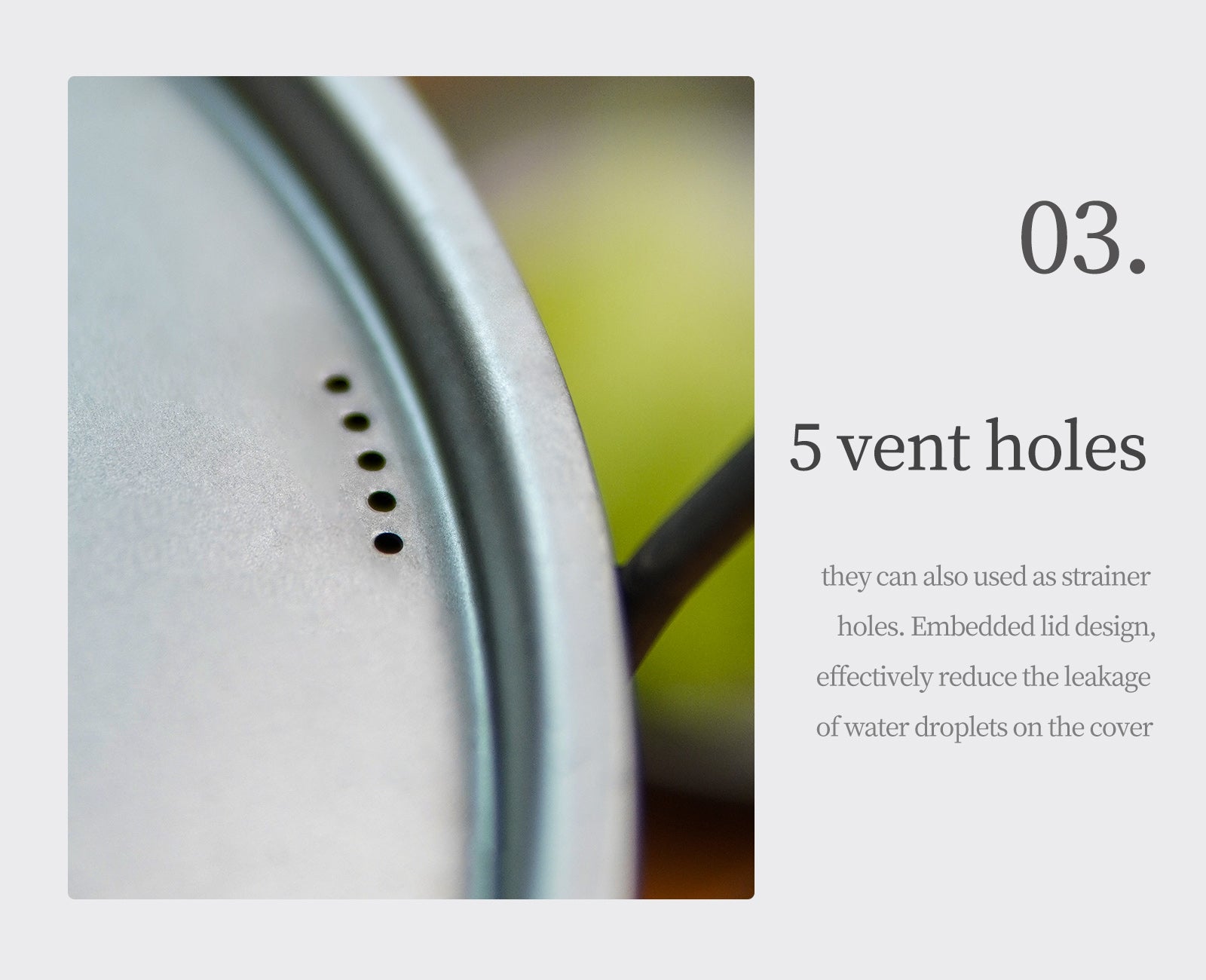 This pot can be used on both induction cooker and naked gas flame. The lid has 5 vent holes and they can also used as strainer holes. Embedded lid design, effectively reduce the leakage of water droplets on the cover.