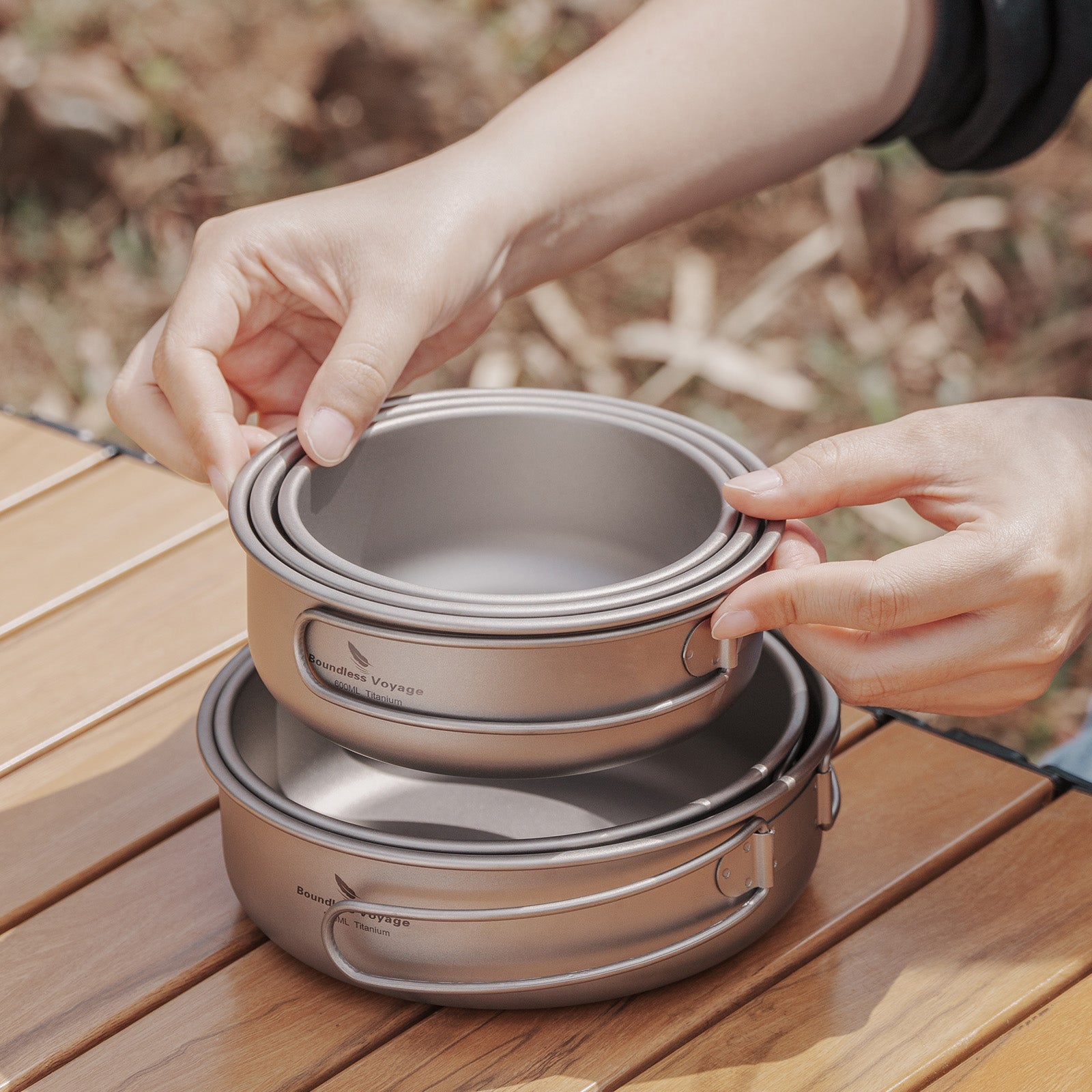 Upgrade your outdoor dining with the Boundless Voyage TA1 Titanium 5-Piece Bowl & Dish Set, featuring five stackable sizes with folding handles for compact storage and easy use. Ultralight, durable, and safe for direct heating, this versatile set is perfect for camp cooking, serving, or eating — whether you're solo backpacking or cooking for a group.