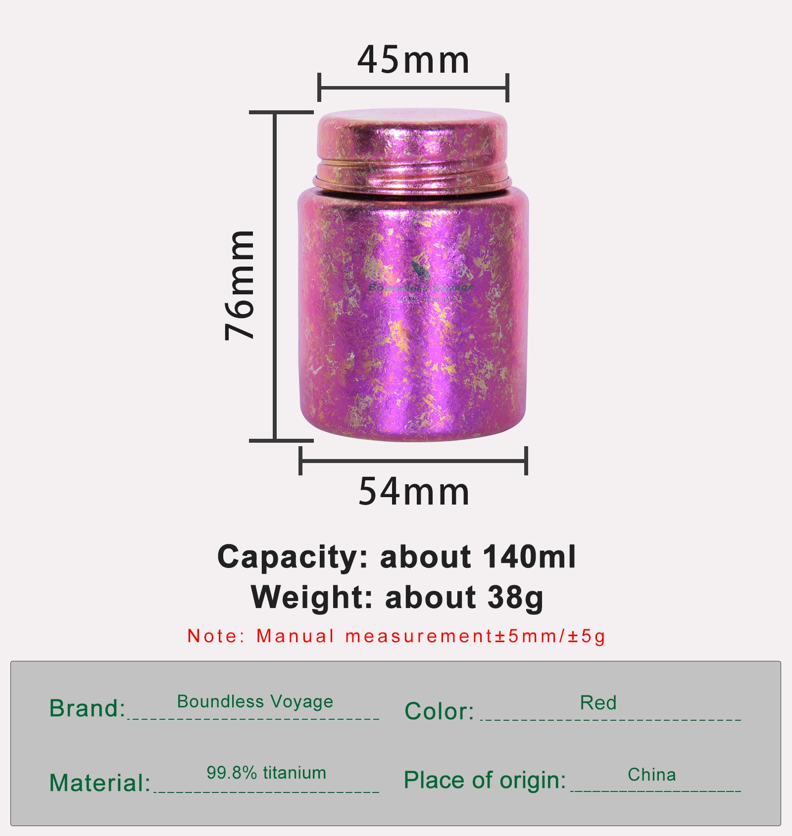 4. Delicate and Durable. The color of the cup is the natural color of titanium under high temperature, without adding a drop of paint. The surface adopts sandblasting technology, elegance metal texture, it is not easy to leave fingerprint traces. Titanium is lightweight, but has high strength and hardness, strong resistance to falling. This Titanium mini jar has a long service life.