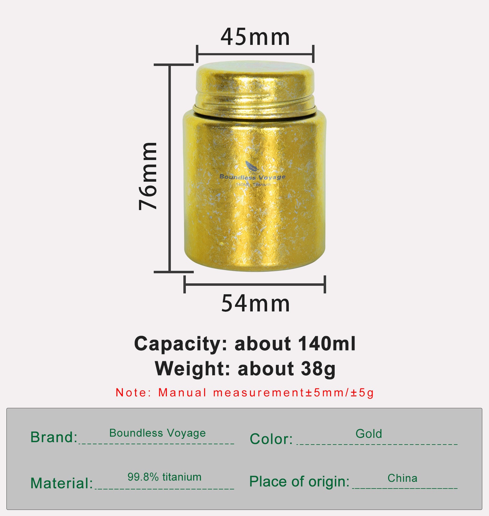 4. Delicate and Durable. The color of the cup is the natural color of titanium under high temperature, without adding a drop of paint. The surface adopts sandblasting technology, elegance metal texture, it is not easy to leave fingerprint traces. Titanium is lightweight, but has high strength and hardness, strong resistance to falling. This Titanium mini jar has a long service life.