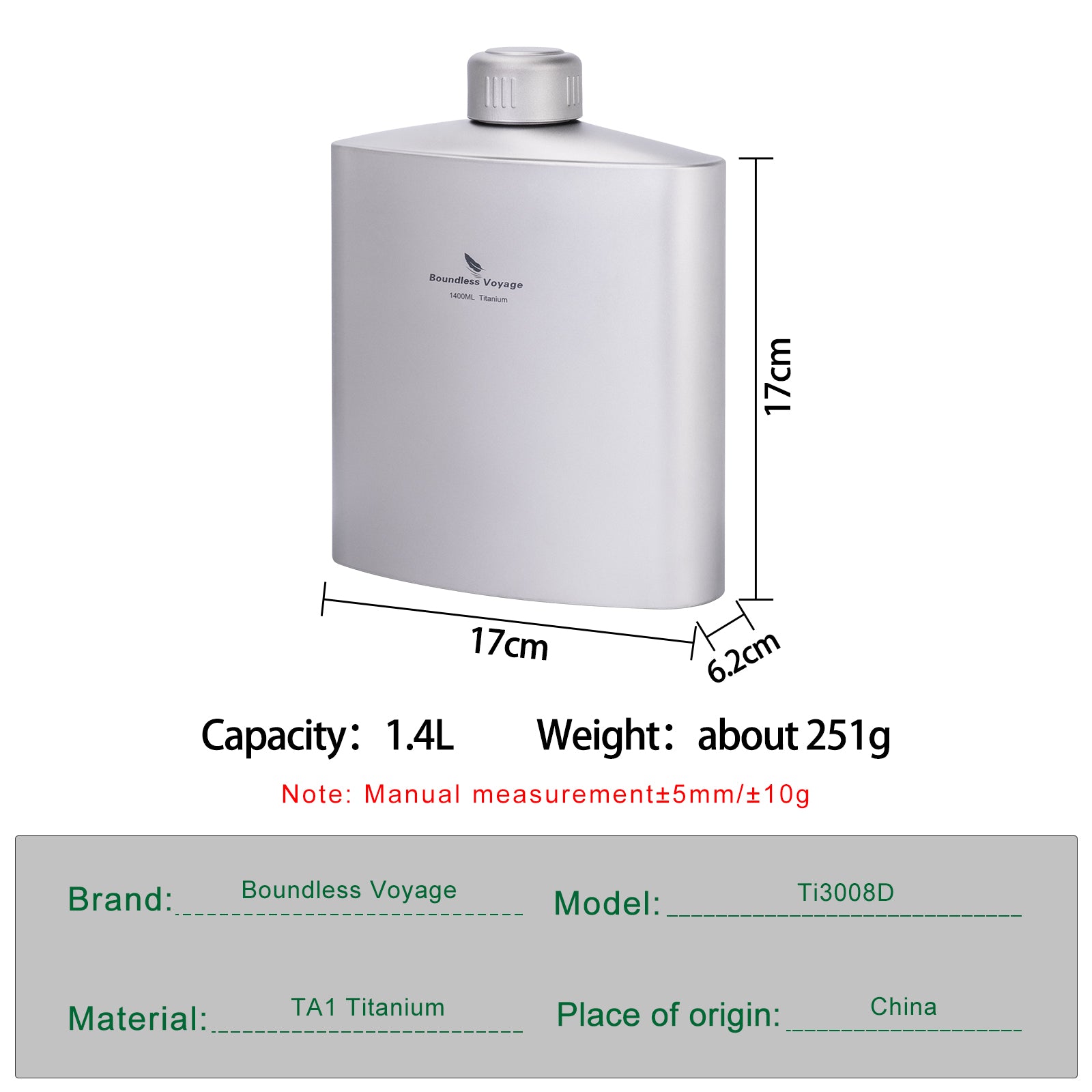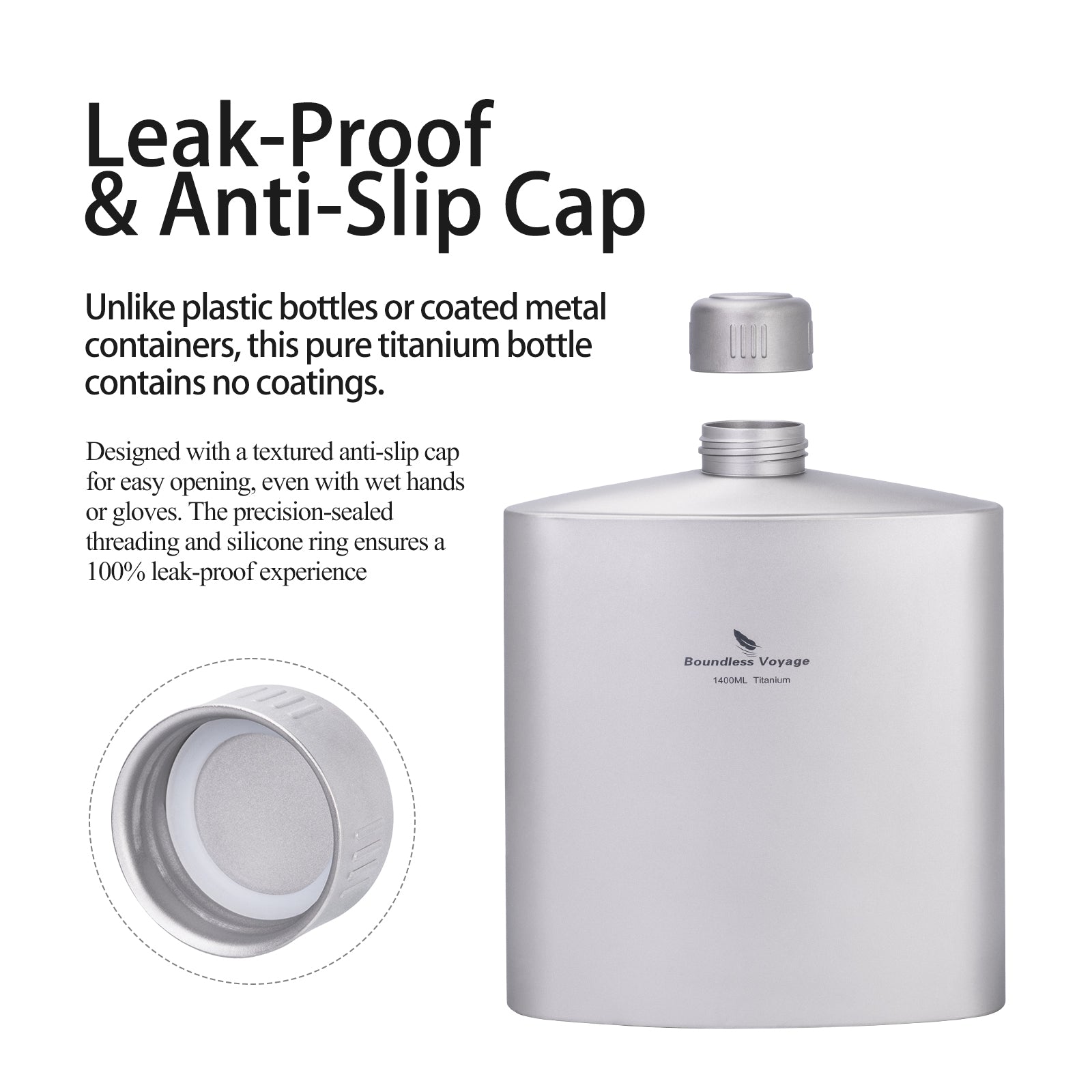 Boundless Voyage Titanium Water Bottle 1.4L – Leak-Proof Anti-Slip Cap, Ultra-Lightweight & Durable, Ideal for Camping, Hiking & Everyday Use
