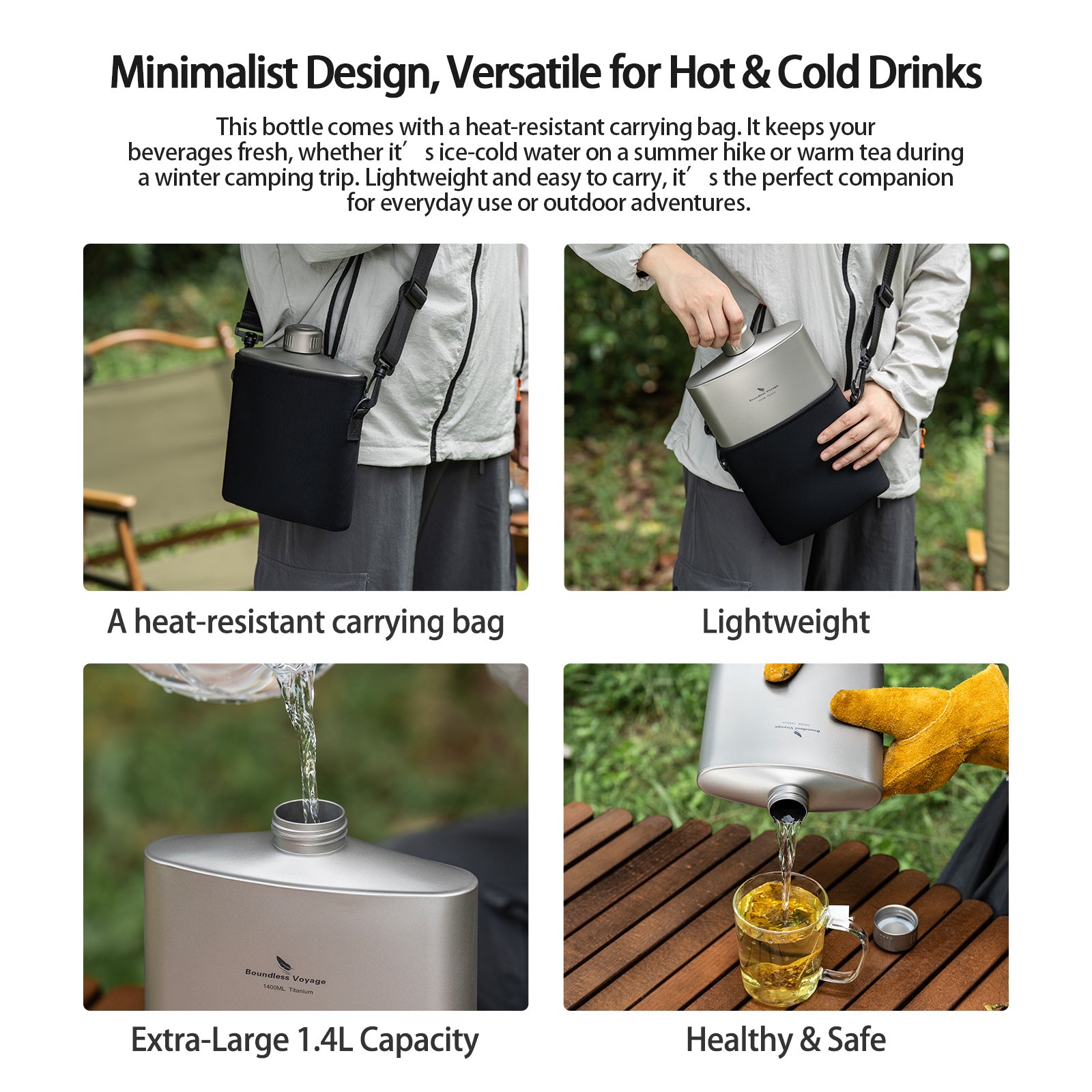 This bottle comes with a heat-resistant carrying bag. It keeps your beverages fresh, whether it’s ice-cold water on a summer hike or warm tea during a winter camping trip. Lightweight and easy to carry, it’s the perfect companion for everyday use or outdoor adventures.