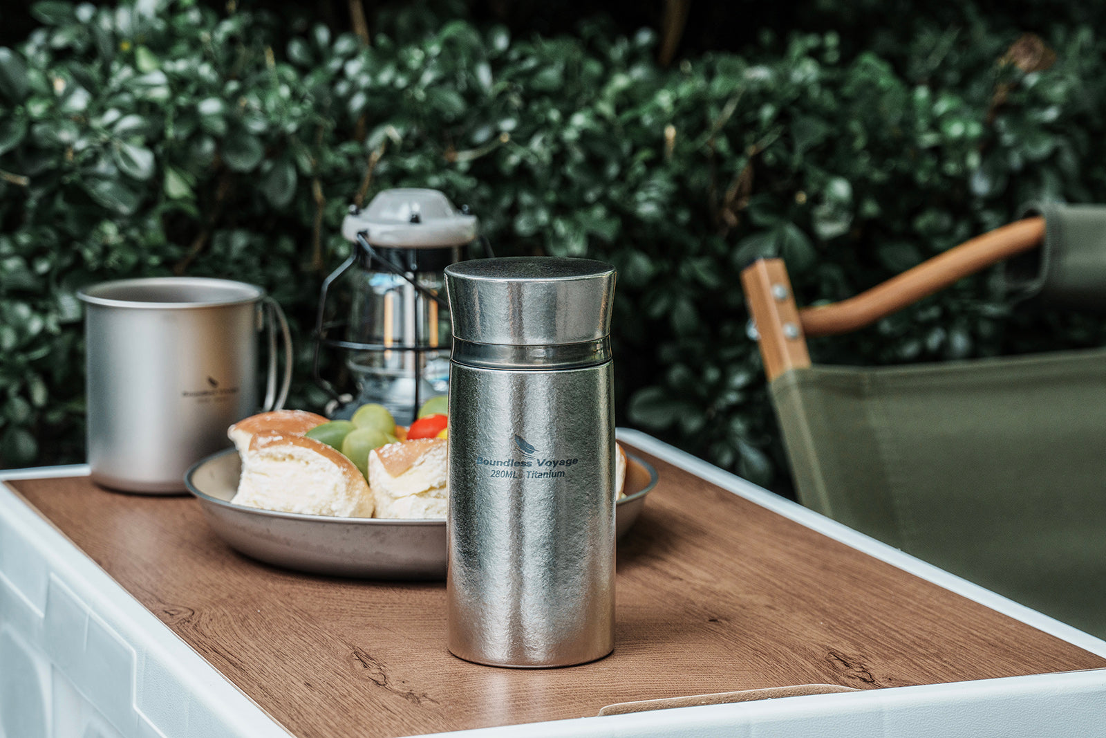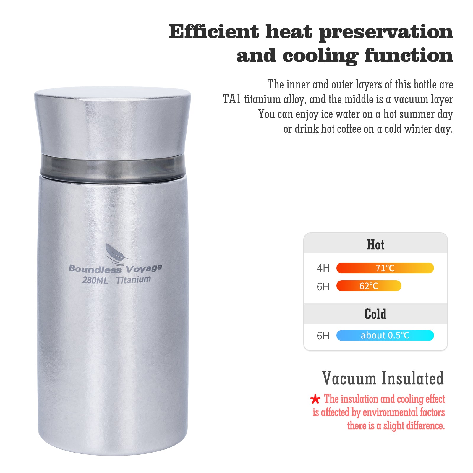 Efficient heat preservation and cooling function: The inner and outer layers of this bottle are TA1 titanium alloy, and the middle is a vacuum layer. Heat preservation aging line :6H ≥ 40℃. Excellent heat and cold insulation effect. You can enjoy ice water on a hot summer day, or drink hot coffee on a cold winter day.