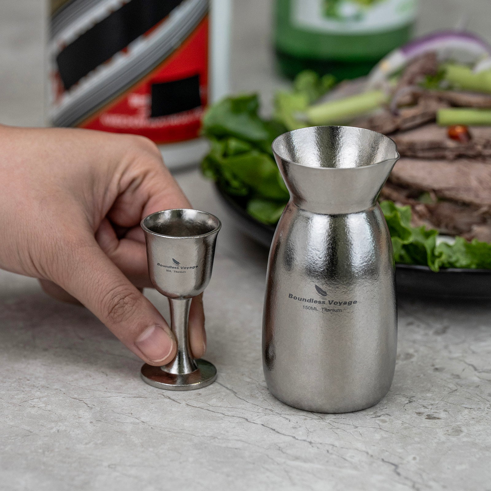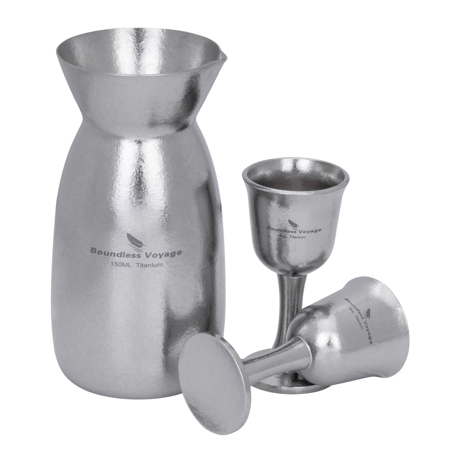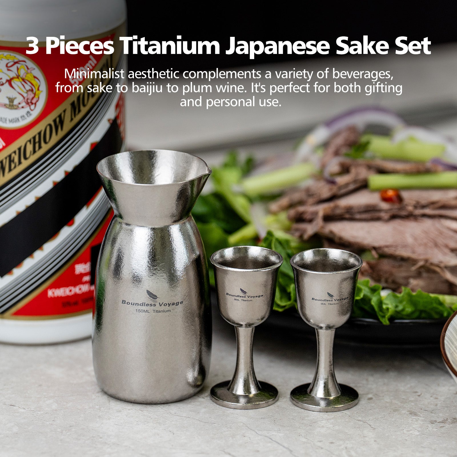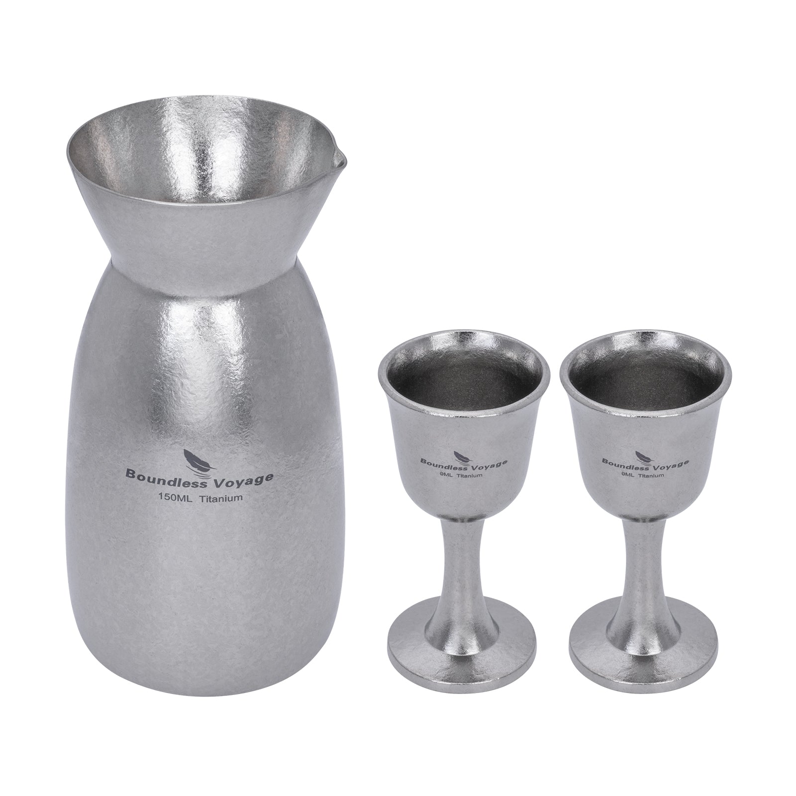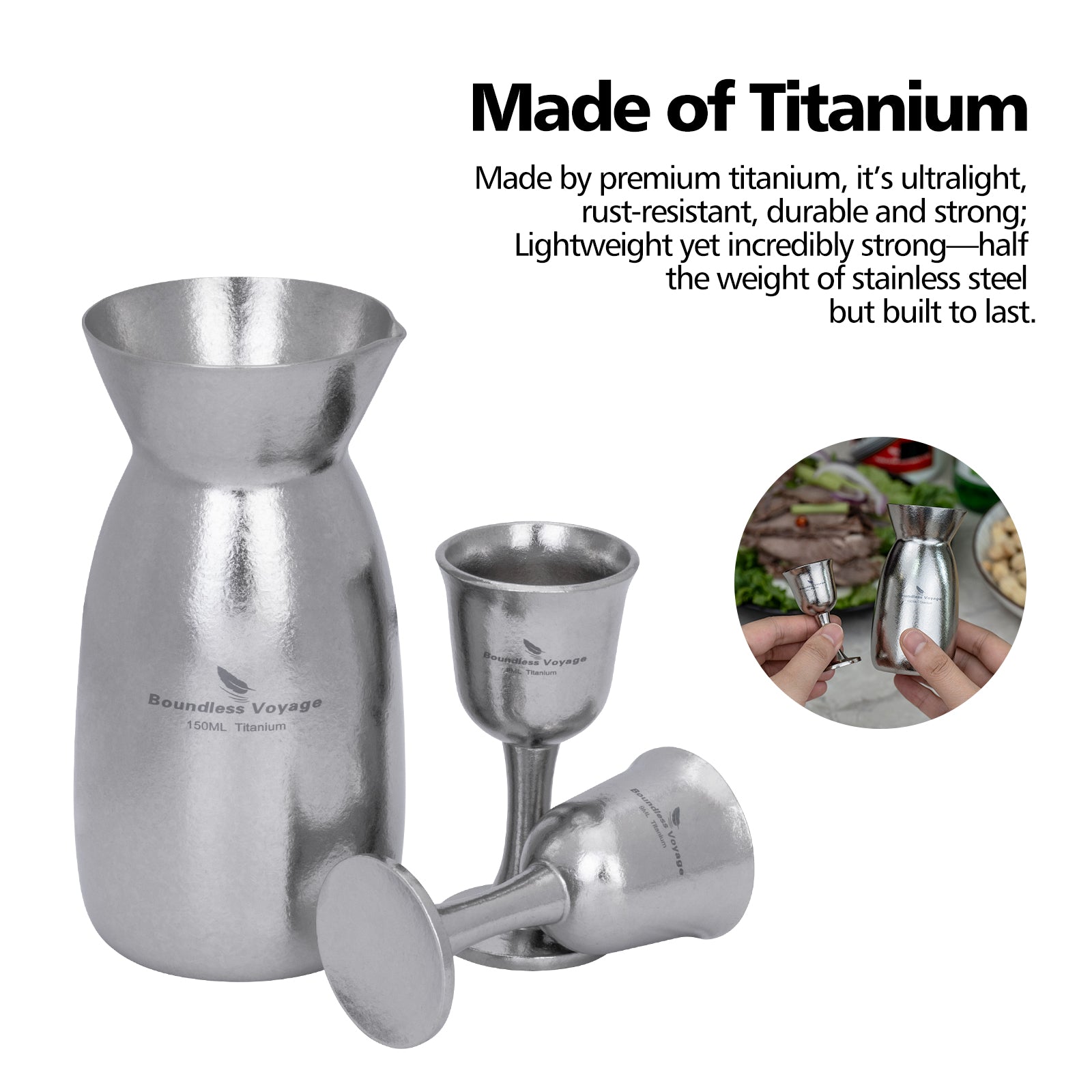 Boundless Voyage 3 Pieces Titanium Japanese Sake Set, 150ml Sake Carafe with 2 Cups, for for Sake Japanese Wine/Soju/Drink/Tea Dishwasher Safe Portable Drinkware for Outdoor Travel