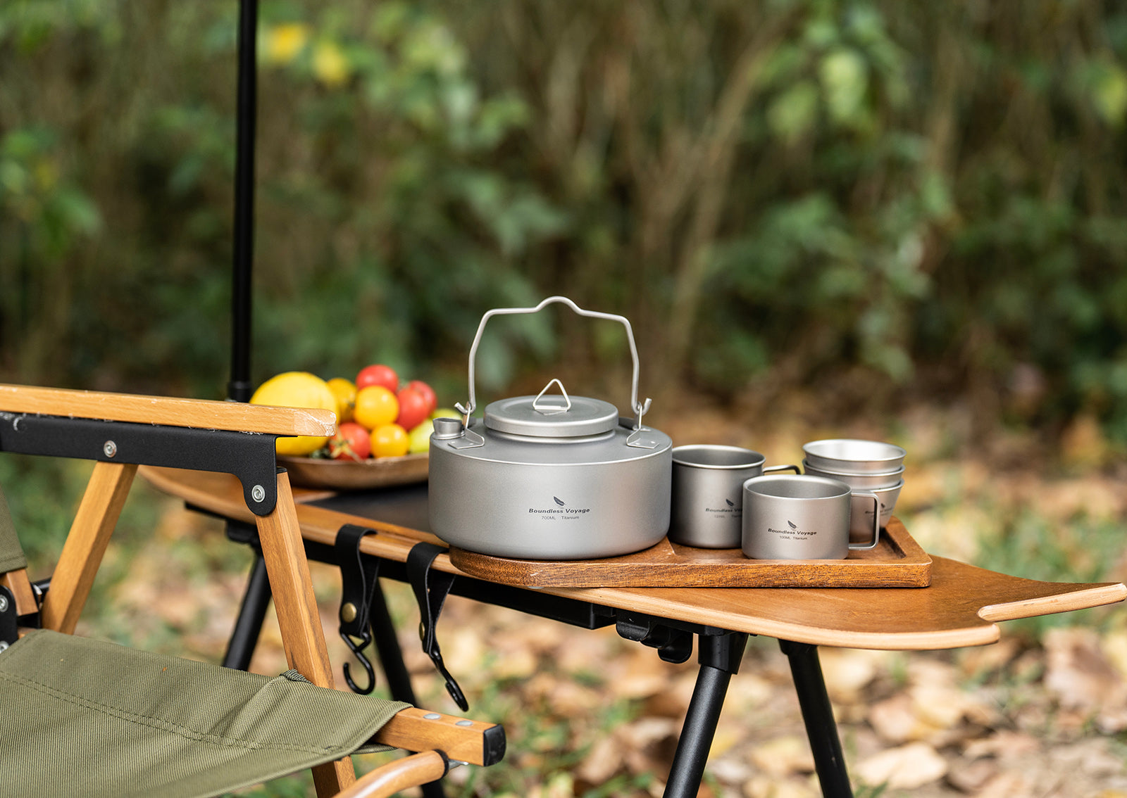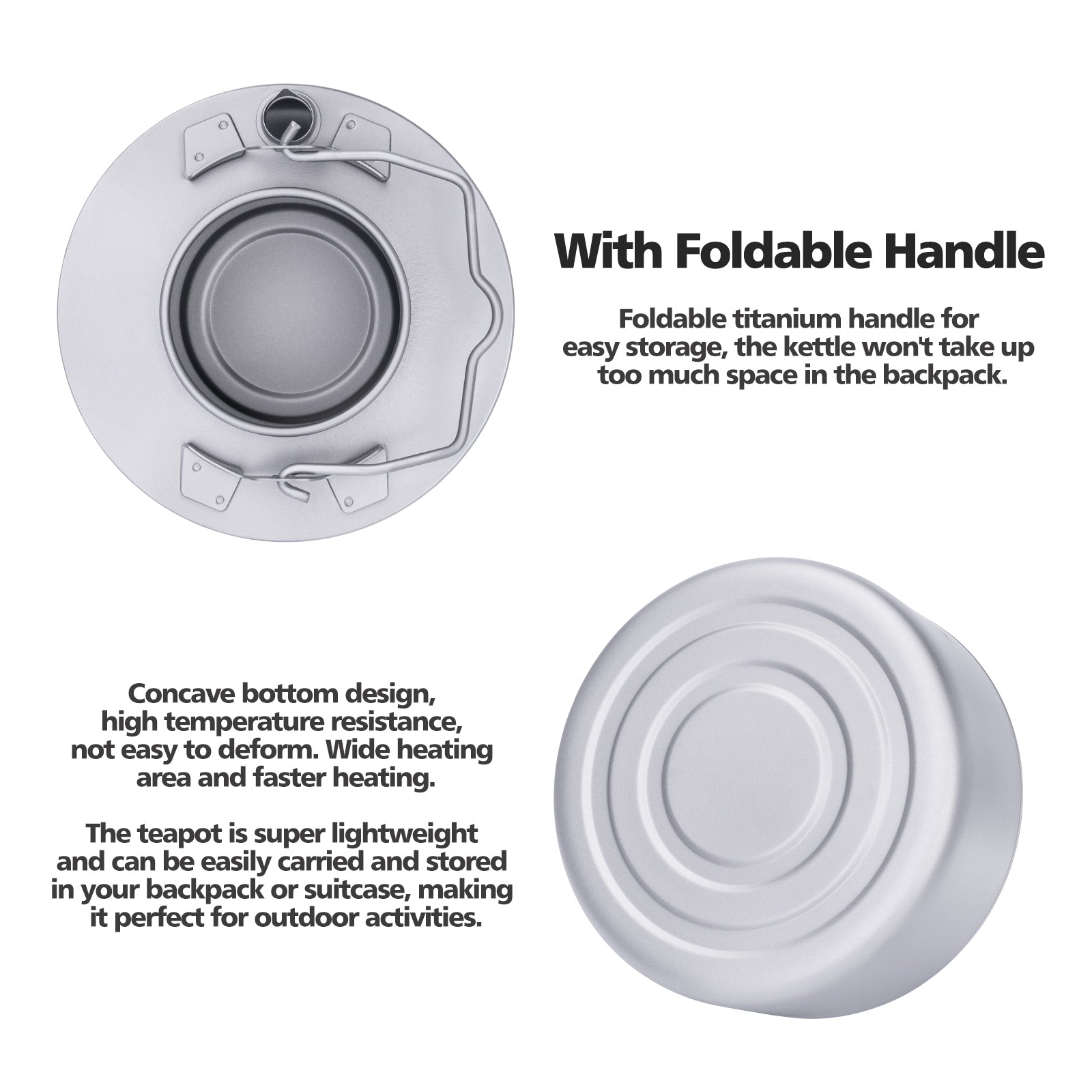 6. 可折叠手柄:可折叠钛金属手柄,方便收纳,水壶不会占用背包太多空间。这款茶壶超轻便携带,可轻松放入背包或行李箱,方便携带和存放,非常适合户外活动。7