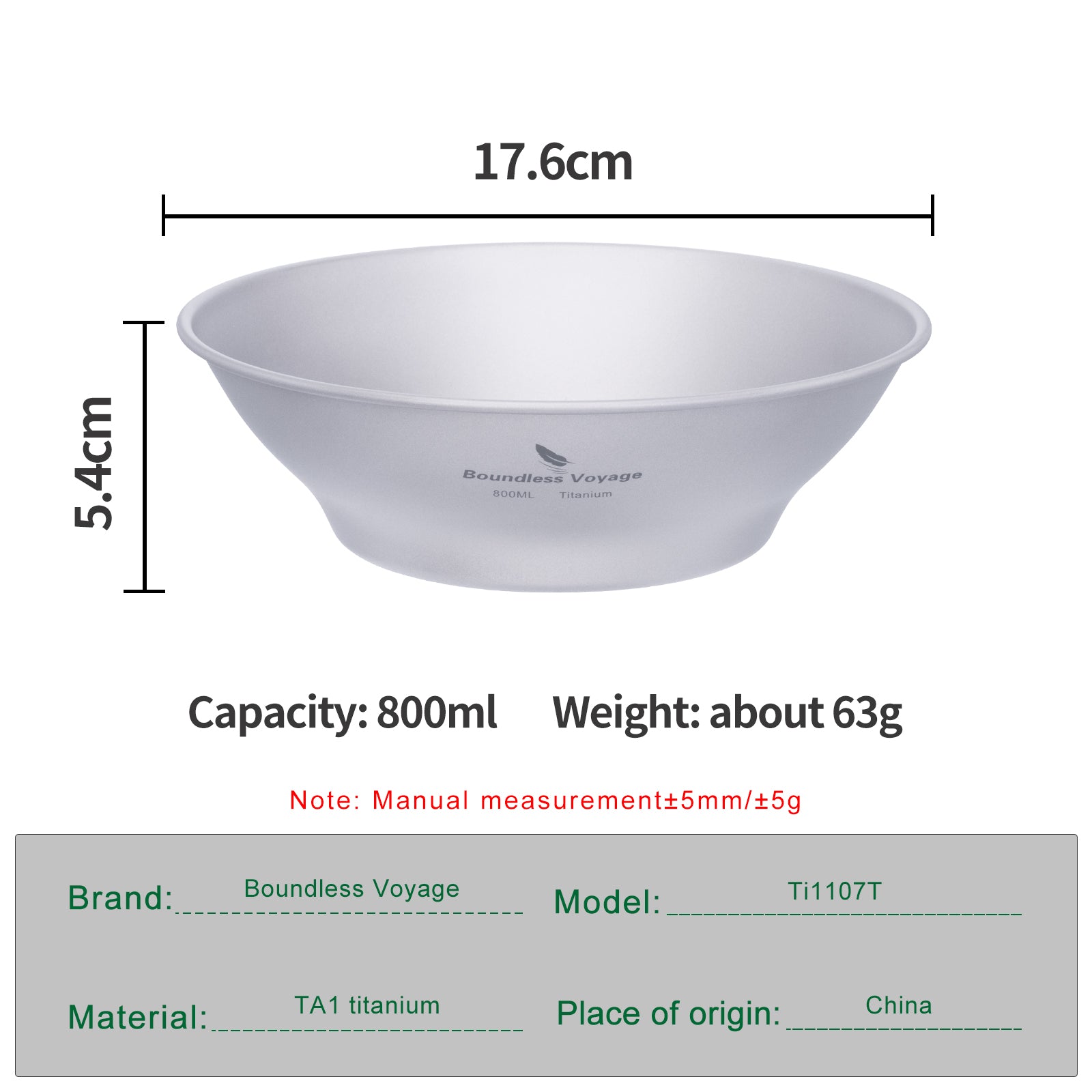 Boundless Voyage Camping Titanium Single-Walled Bowls Lightweight Dish Plate Outdoor Tableware 800ml