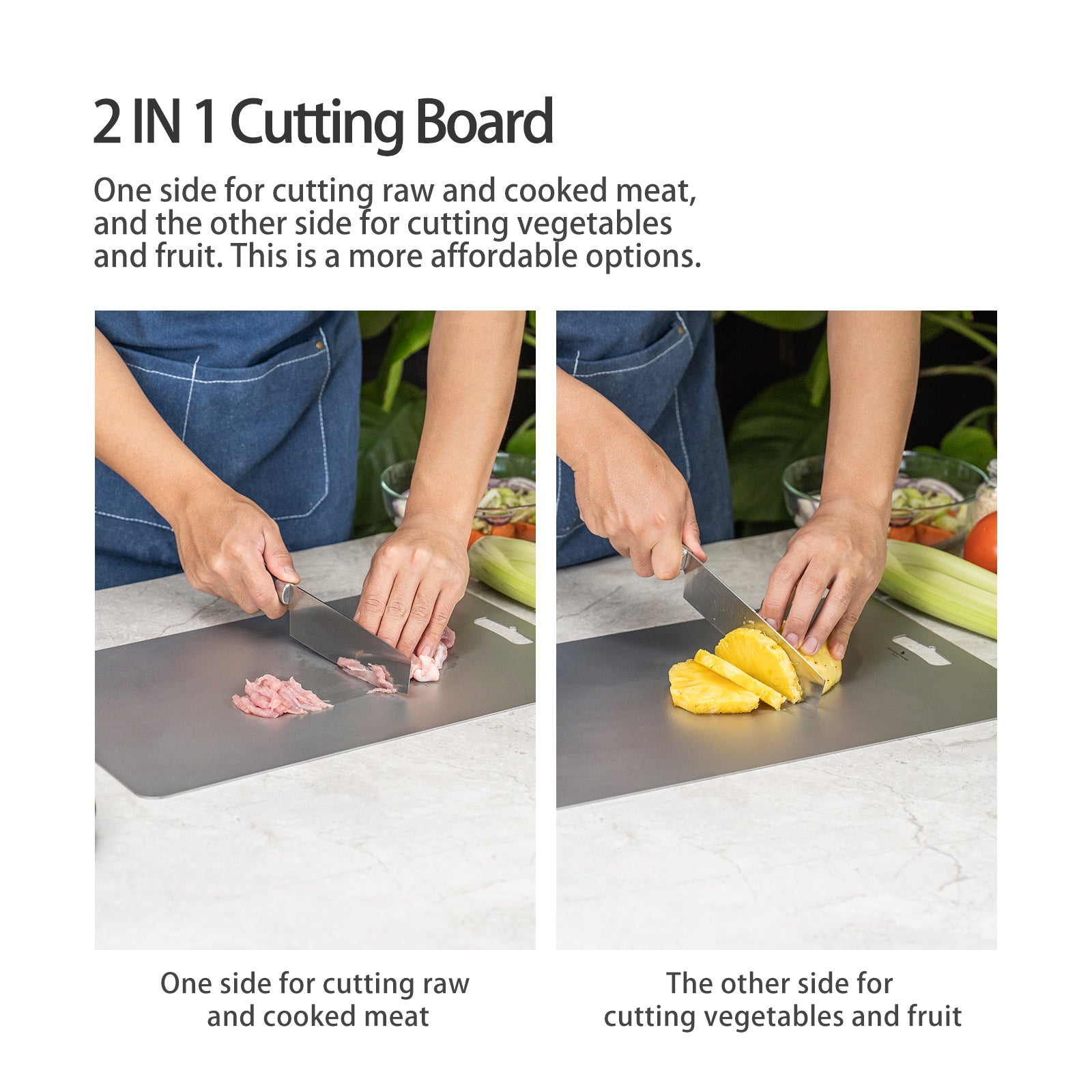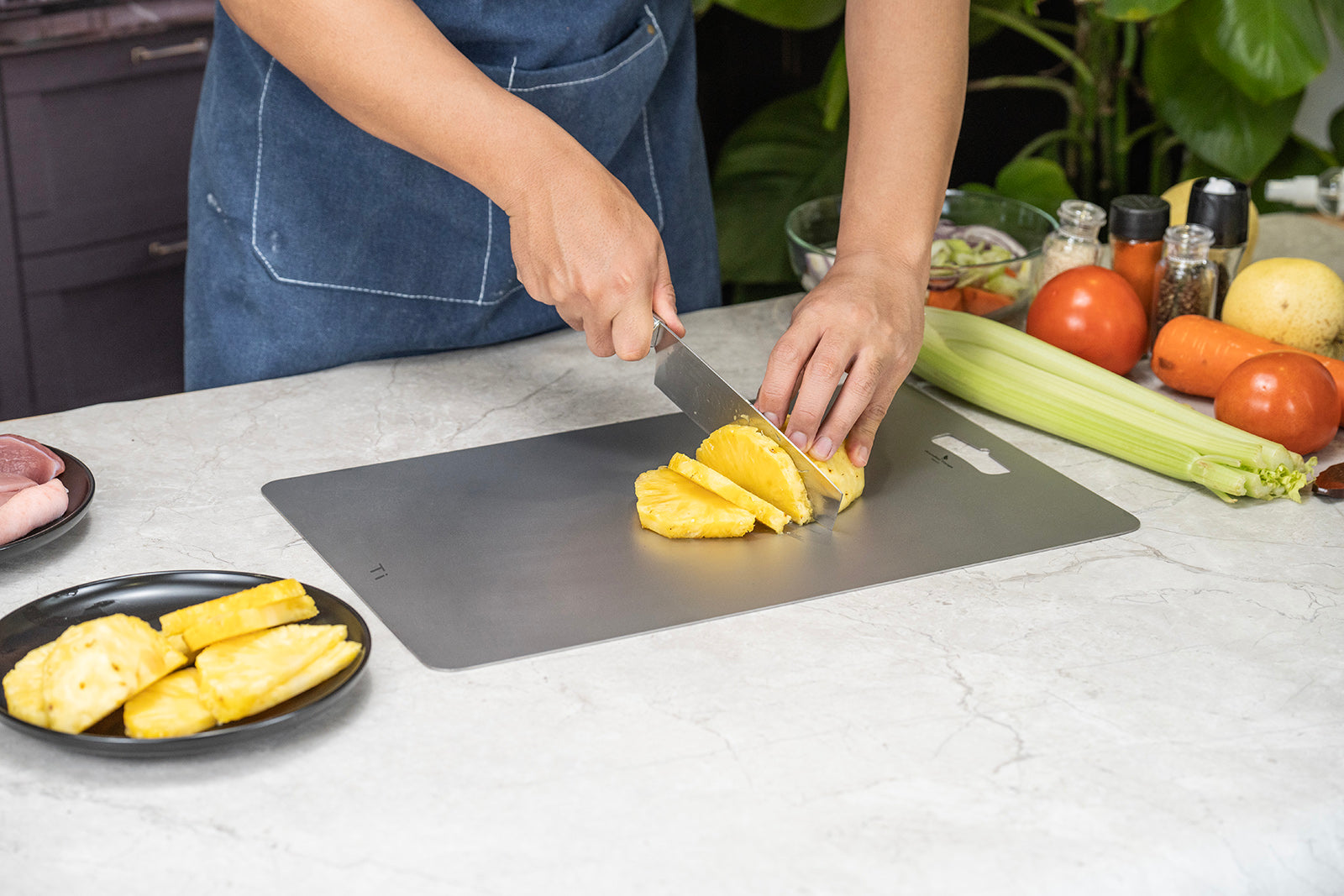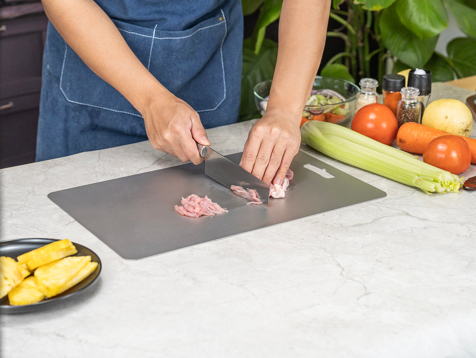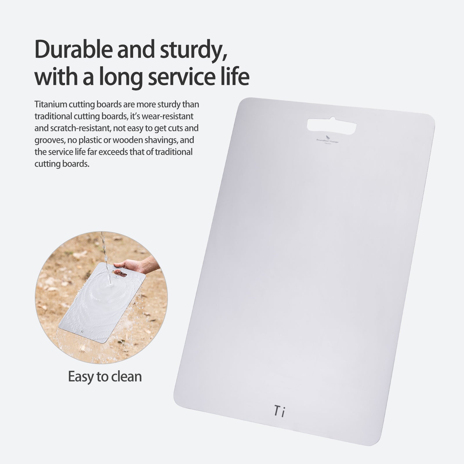 Titanium cutting boards are more sturdy than traditional cutting boards, it's wear-resistant and scratch-resistant, not easy to get cuts and grooves, no plastic or wooden shavings, and the service life far exceeds that of traditional cutting boards;