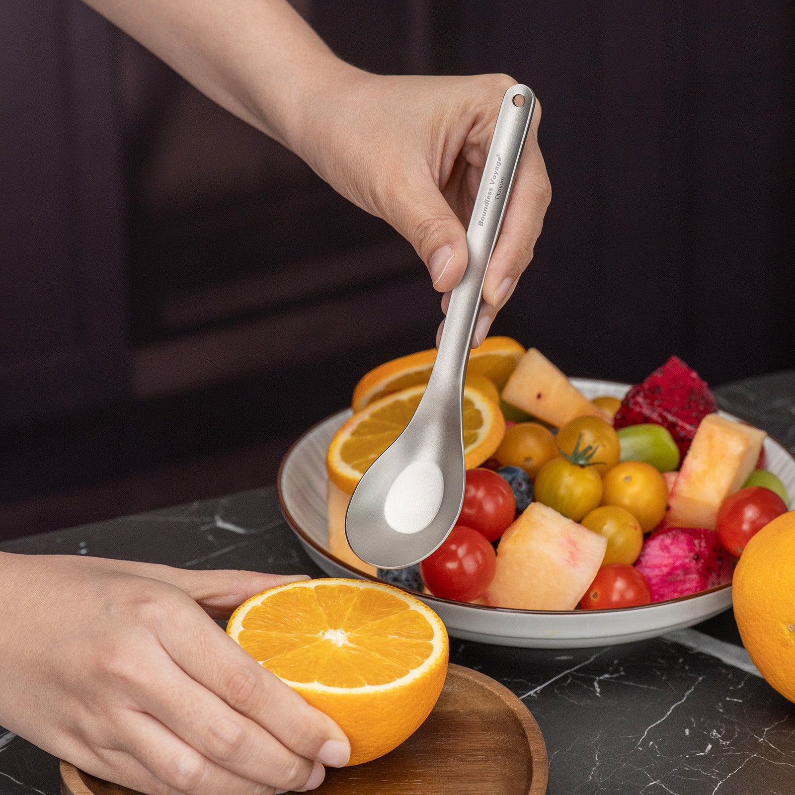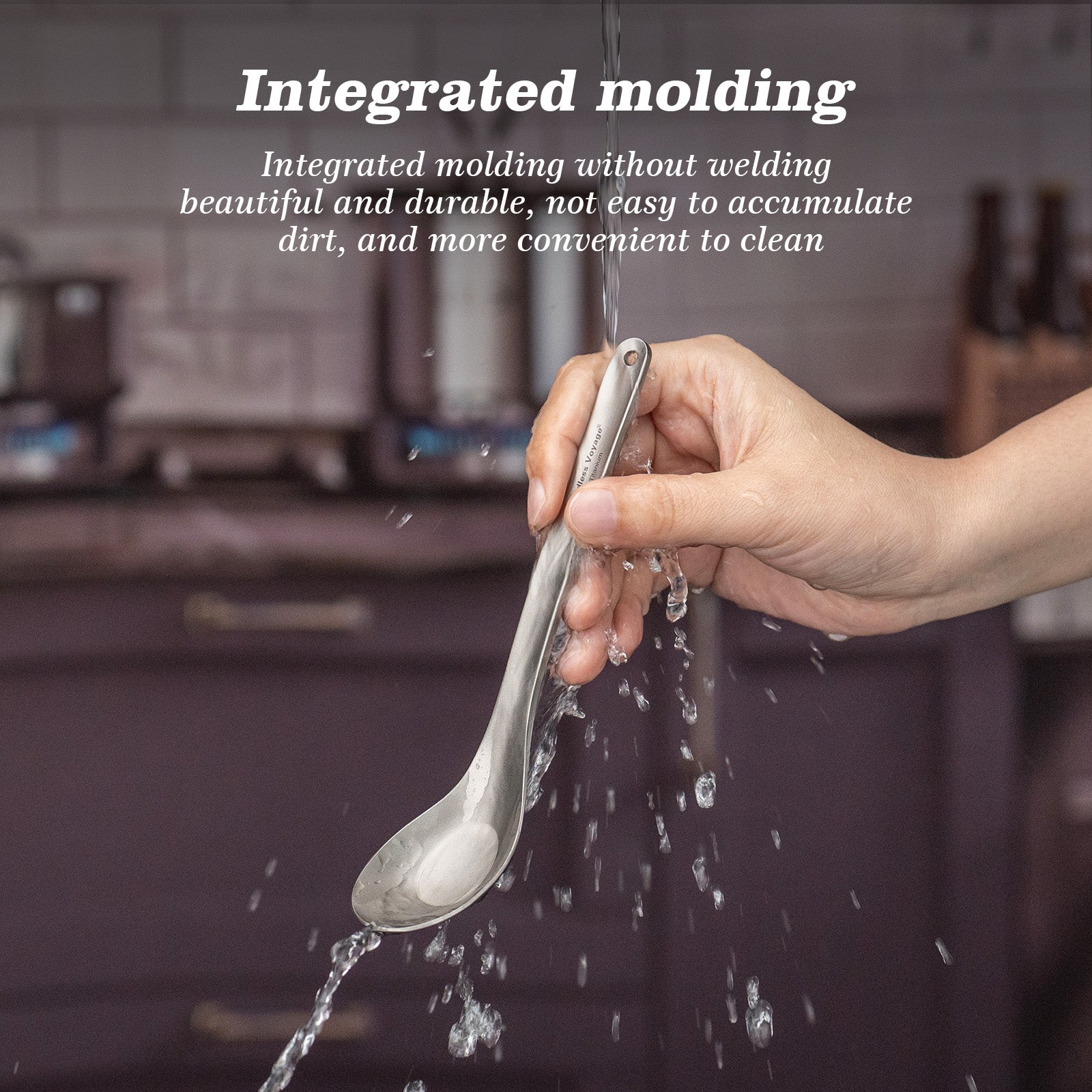 The spoon handle features an approximately 12cm extended design, reducing the risk of steam burns and allowing easy access to the bottom of containers. The handle is equipped with a hangable hole for more convenient storage.