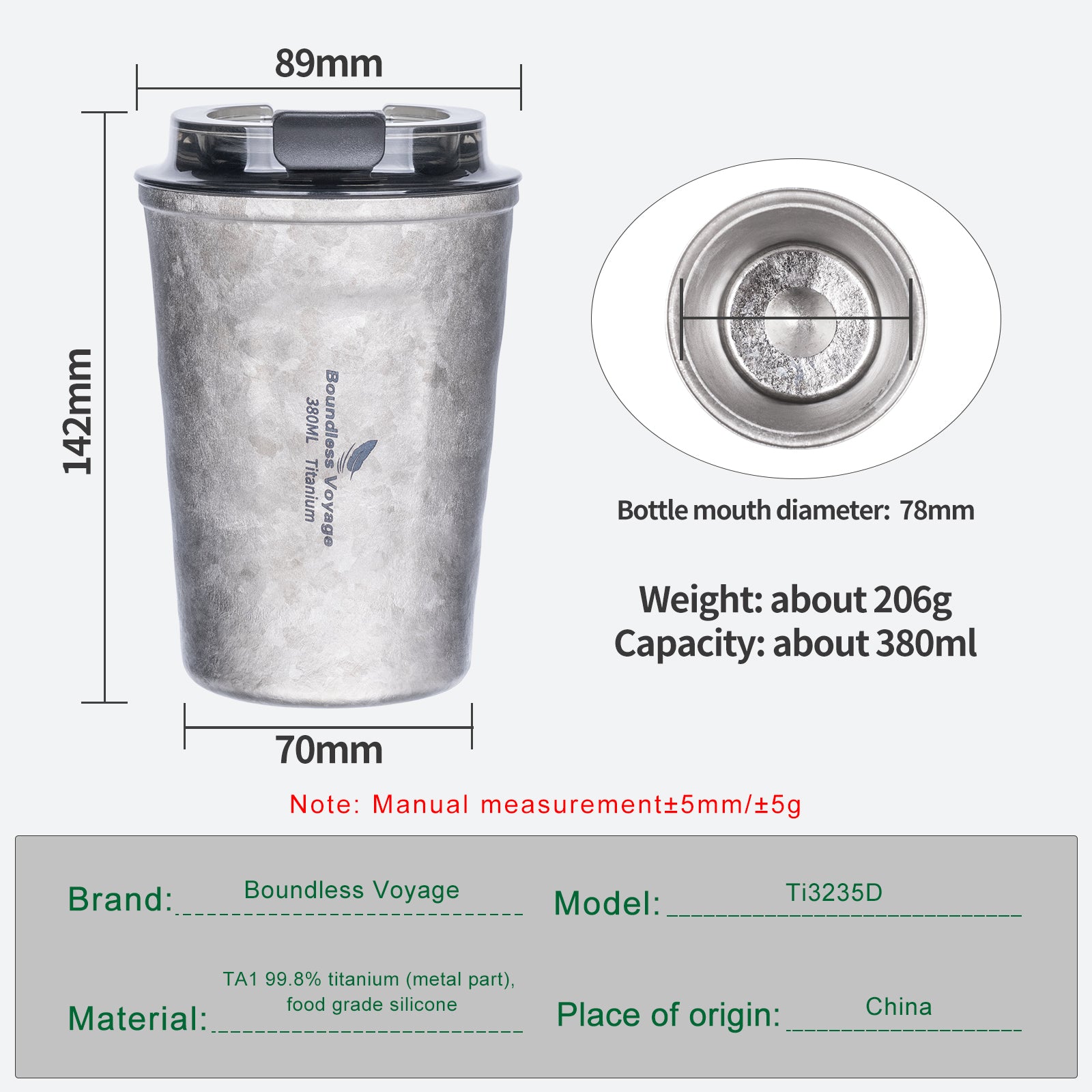 Material: TA1 99.8% titanium (metal part), food grade silicone