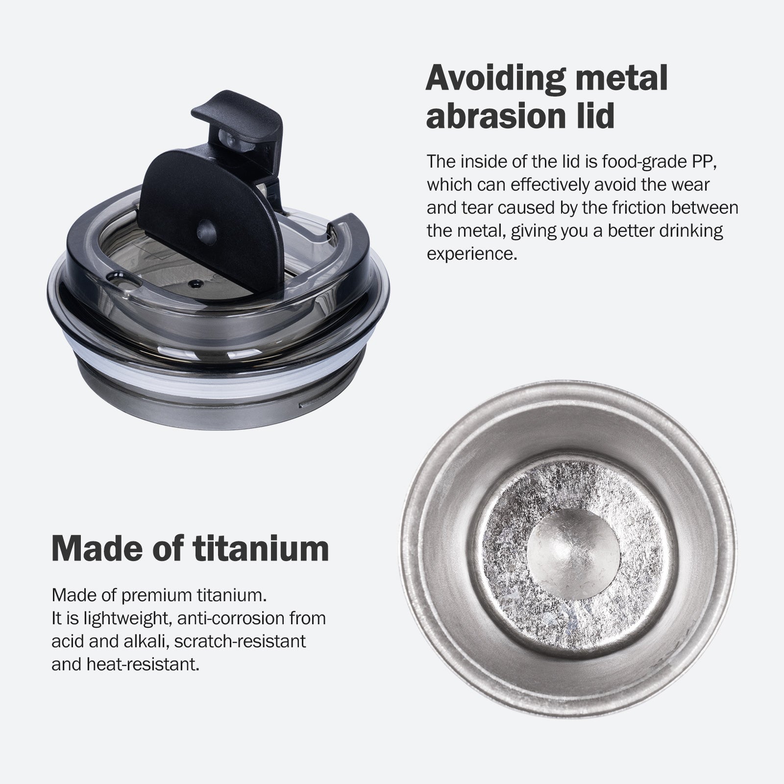 The inside of the lid is food-grade PP, which can effectively avoid the wear and tear caused by the friction between the metal, giving you a better drinking experience.