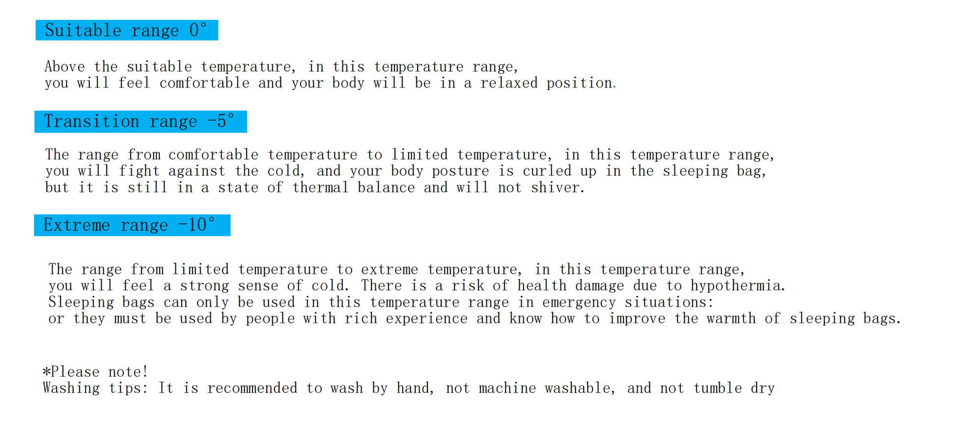 Note: The applicable temperature is for reference only. People who are susceptible to cold are advised to choose a sleeping bag with a temperature scale lower than the actual temperature. The statistical data are all manual data measurement results, which will have certain errors and will not be used as a reason for compensation.